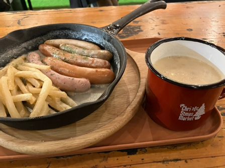ソーセージとクラムチャウダーを注文し寒空のなかおいしく頂きました。