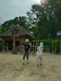 竹で作られた「ぽっくり」に夢中な娘たち☺️